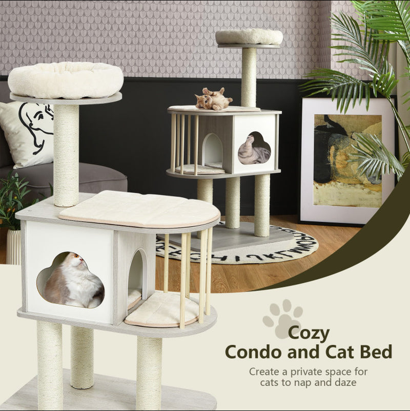 Wooden Multi-Level Modern Cat Tower with Scratching Board and Post